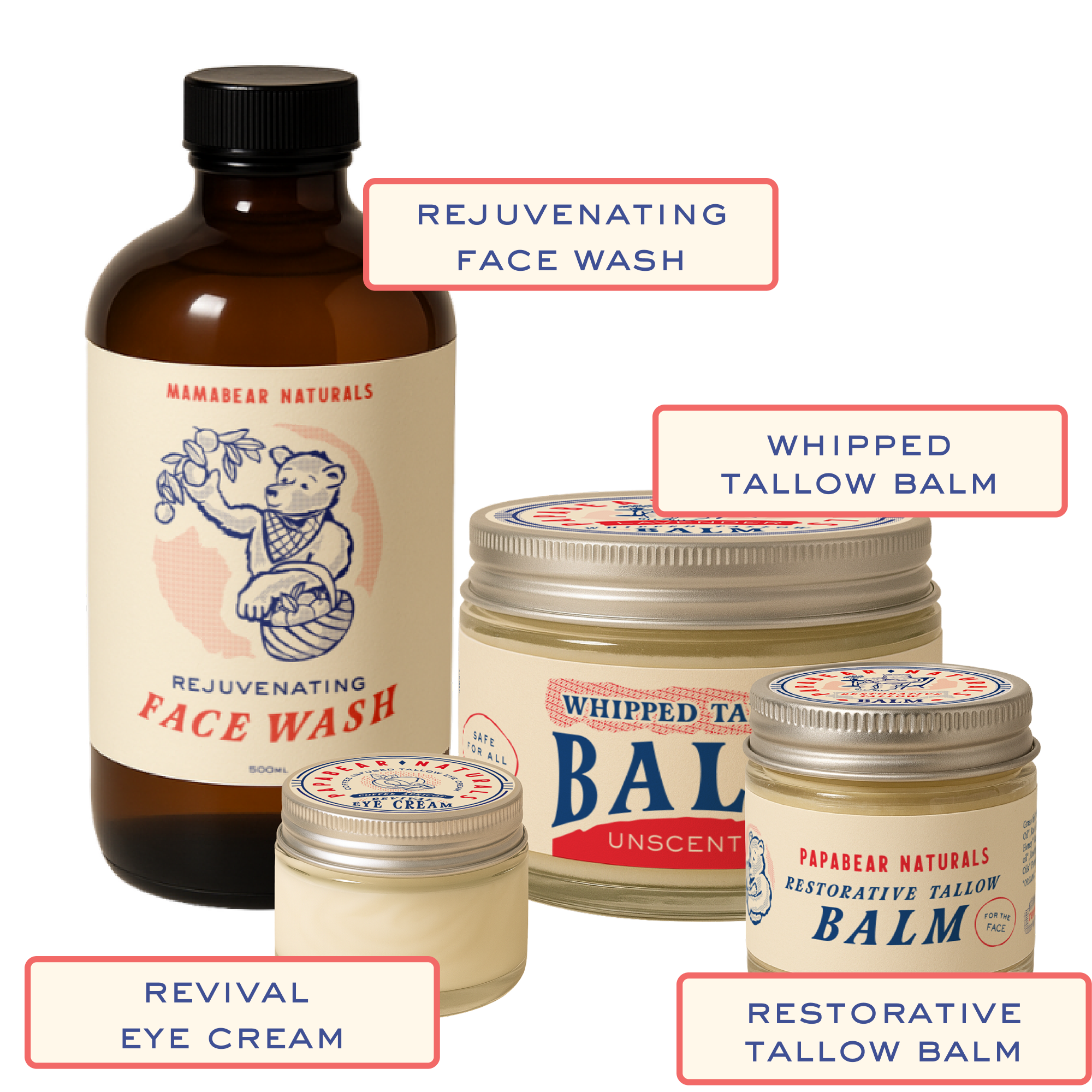 From sunrise to lights-out, this clean routine actually works: Rejuvenating Face Wash, Revival Eye Cream, Restorative Tallow Balm, and Whipped Tallow Balm. No chemicals, fillers, or fake fragrance—just God-given ingredients your skin trusts. Small-batch family-owned, handcrafted in the USA. Balanced hydration and barrier support.