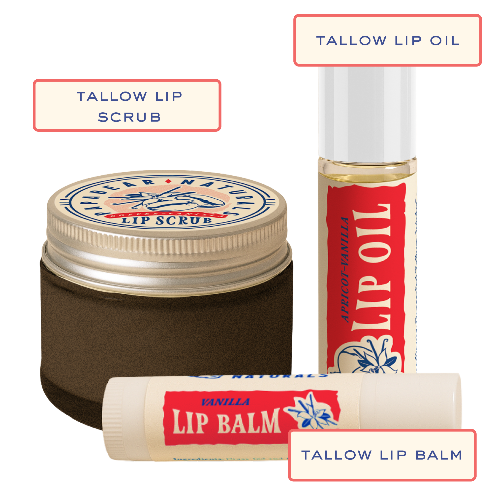 Meet the complete lip care routine your lips have been waiting for. The Papabear Lip Care Kit includes our Tallow Lip Balm, Lip Scrub, and Lip Oil, each handcrafted in small batches in the USA with pure grass-fed tallow and real ingredients