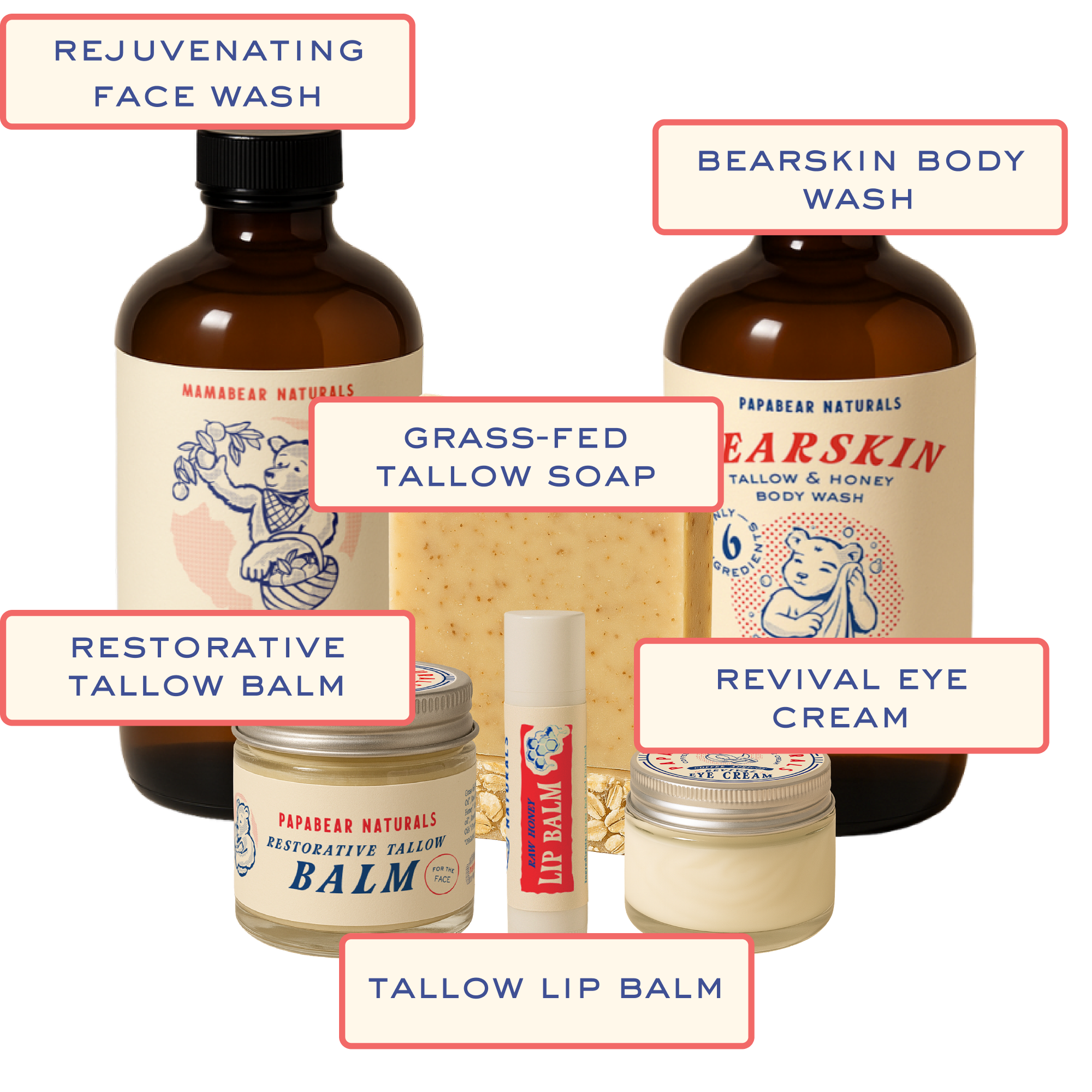 Includes 1x Restorative Tallow Balm, 2x Bearskin Body Wash, 5x Tallow Lip Balm, 1x Rejuvenating Face Wash, 1x Revival Eye Cream, 4x Grass-Fed Tallow Soap.