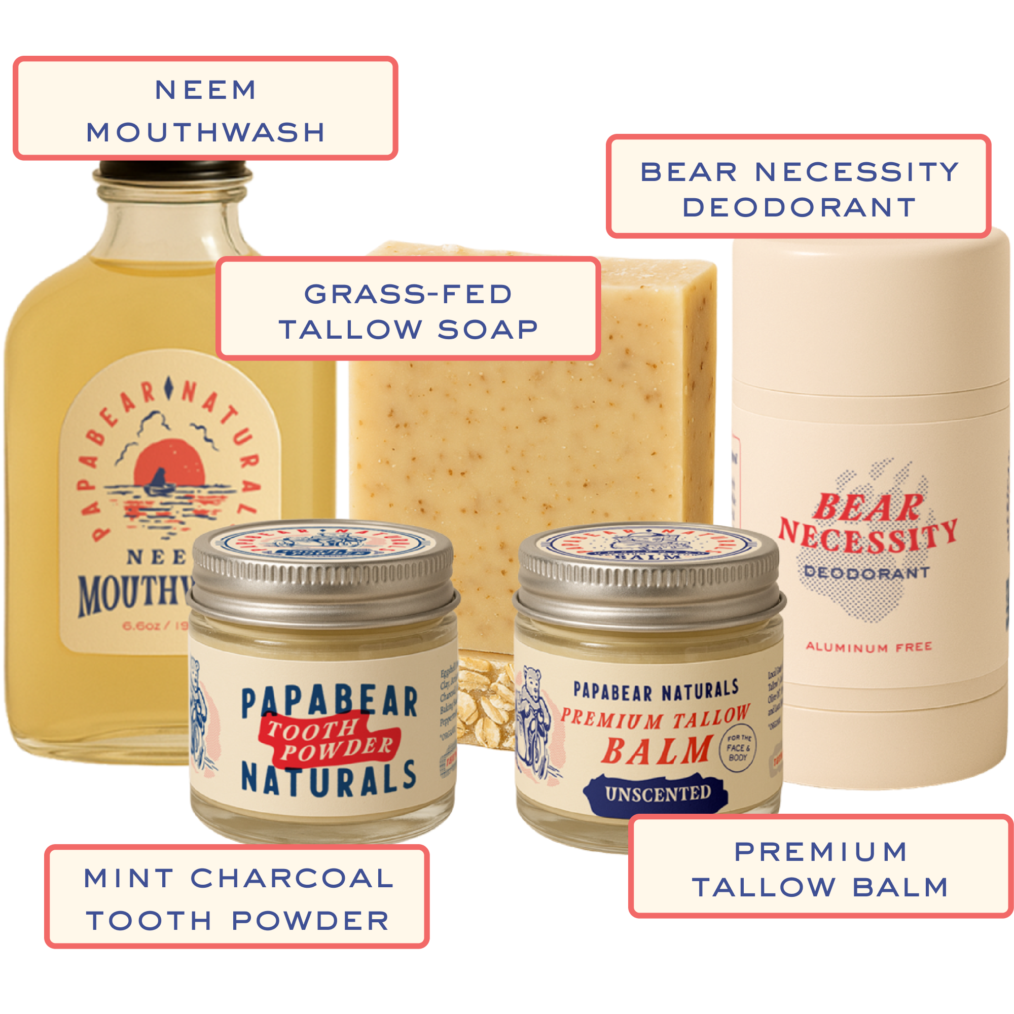 Bundle your self care essentials and save. Enjoy feeling your freshest with our best selling Premium Tallow Balm, Mint Charcoal Tooth Powder, Bear Necessity Deodorant, a 2 pack of Neem Mouthwash, and a 2 pack of Tallow Soap. There’s no: aluminum, fluoride, SLS, parabens, artificial fragrances, microplastics, fillers, or chemicals in our products EVER. Our ingredients are all organic, locally sourced, and handmade in USA.