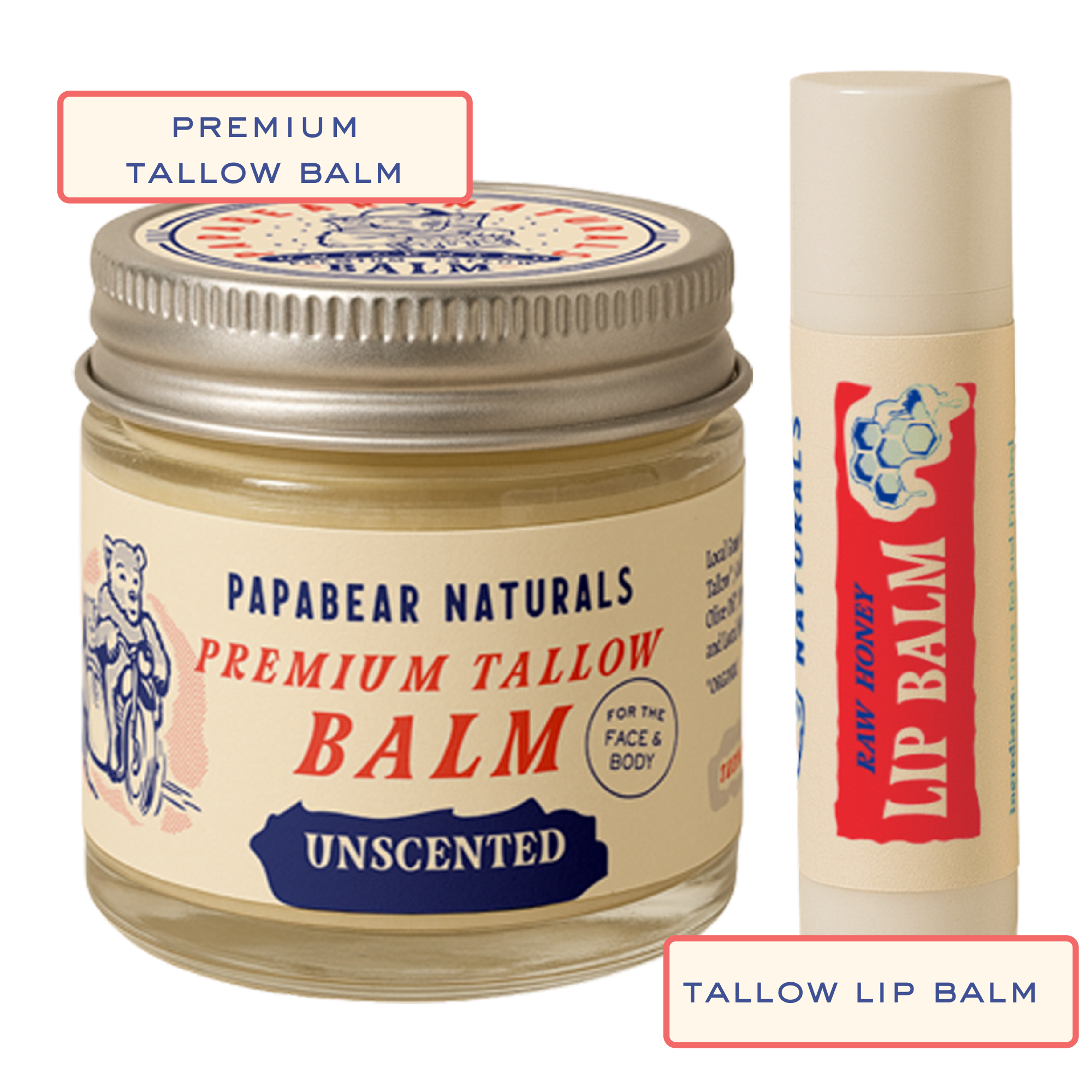 Two of our most popular goods—the Original All-American Tallow Balm with Now-Viral Tallow Lip Balm. Whether it’s lackluster skin or dry lips, this duo was built for deep, long-lasting hydration and nourishment—one clean, honest ingredient at a time.