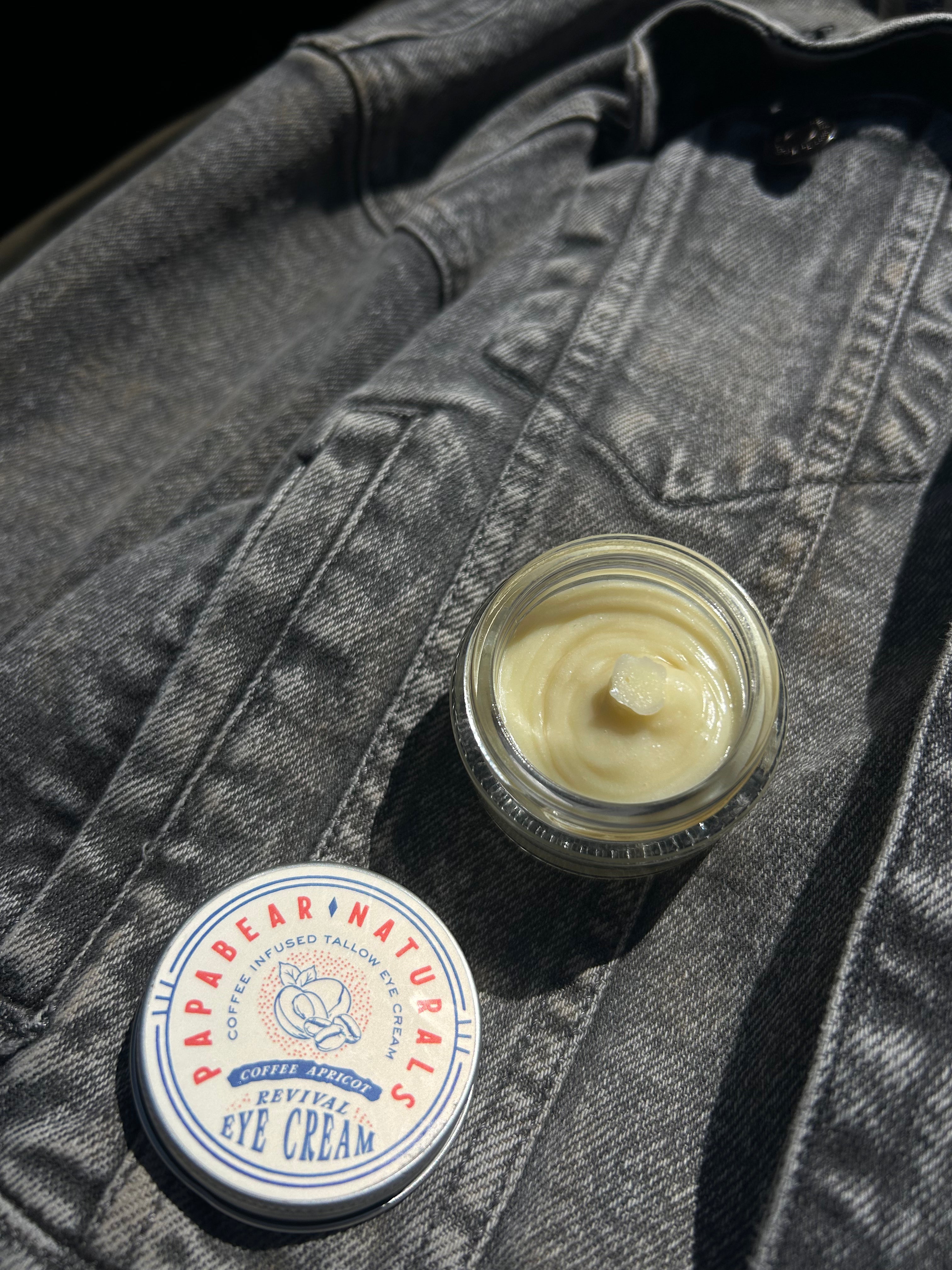 Revival Eye Cream is crafted with organic grass-fed tallow, coffee extract, vitamin E and raw honey to reduce puffiness, brighten dark circles and soften the appearance of fine lines. Blended with olive and apricot oils for lasting hydration, it’s gentle on sensitive skin—no fillers, no synthetic junk, just results you can trust