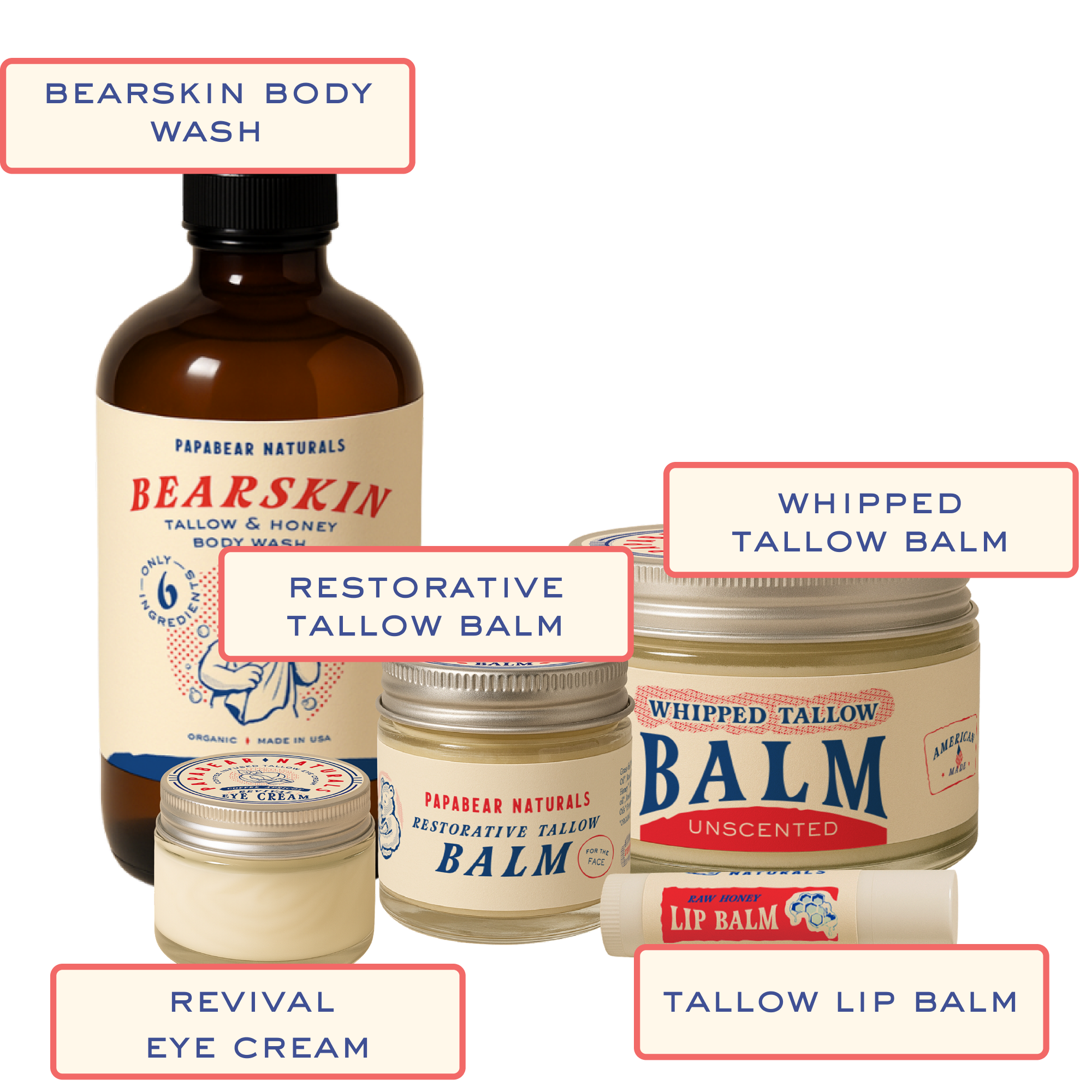 A six-month supply of full-body nourishment with Whipped Tallow Balm, Restorative Tallow Balm, Revival Eye Cream, Tallow Lip Balm and Bearskin Body Wash, this all-in-one regimen is made with pure, organic, locally sourced ingredients—and zero junk. No aluminum. No parabens. No sodium lauryl sulfate, artificial fragrances, fillers, or sketchy chemicals. Just small-batch, American-made goods rooted in tradition. Make self care great again—the Papabear way.